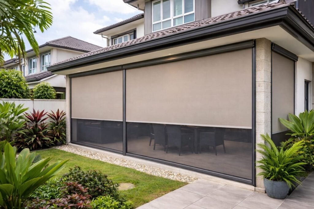 Track-guided Ziptrak blinds designed for Sarawak weather, offering strong wind and rain resistance.