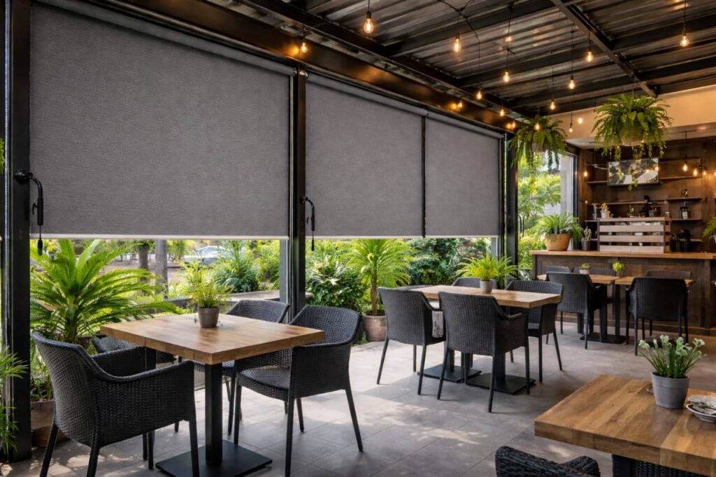 We offer outdoor roller blinds, sunscreen blinds, Ziptrak-style blinds and motorised outdoor blinds suitable for homes, porches, cafes and shoplots.