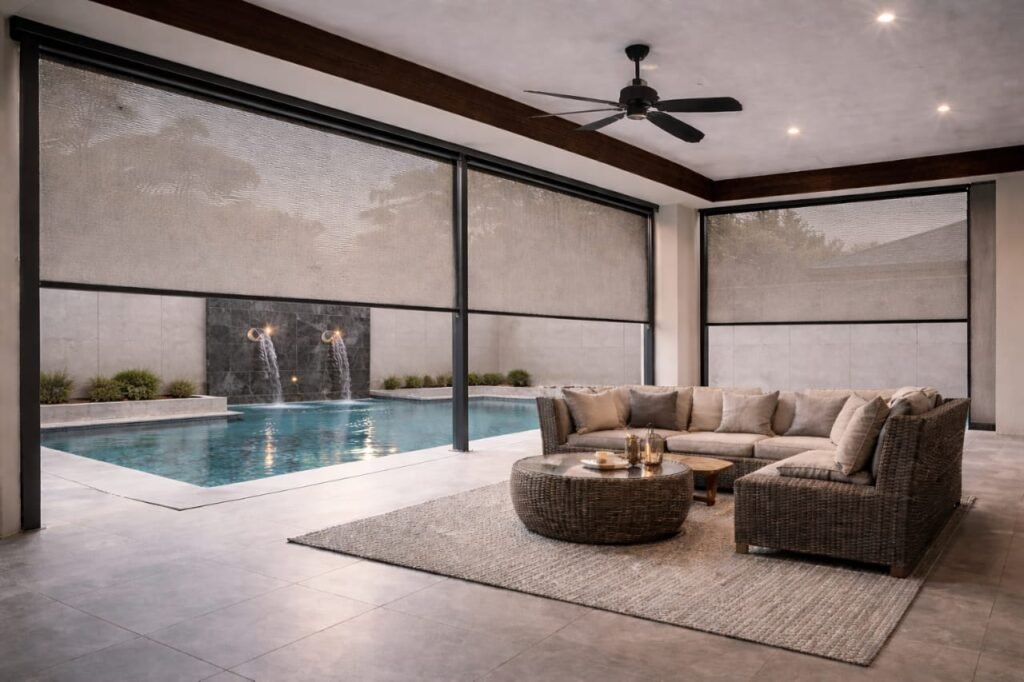 Modern motorised outdoor blinds with remote or smart control for comfort and convenience.